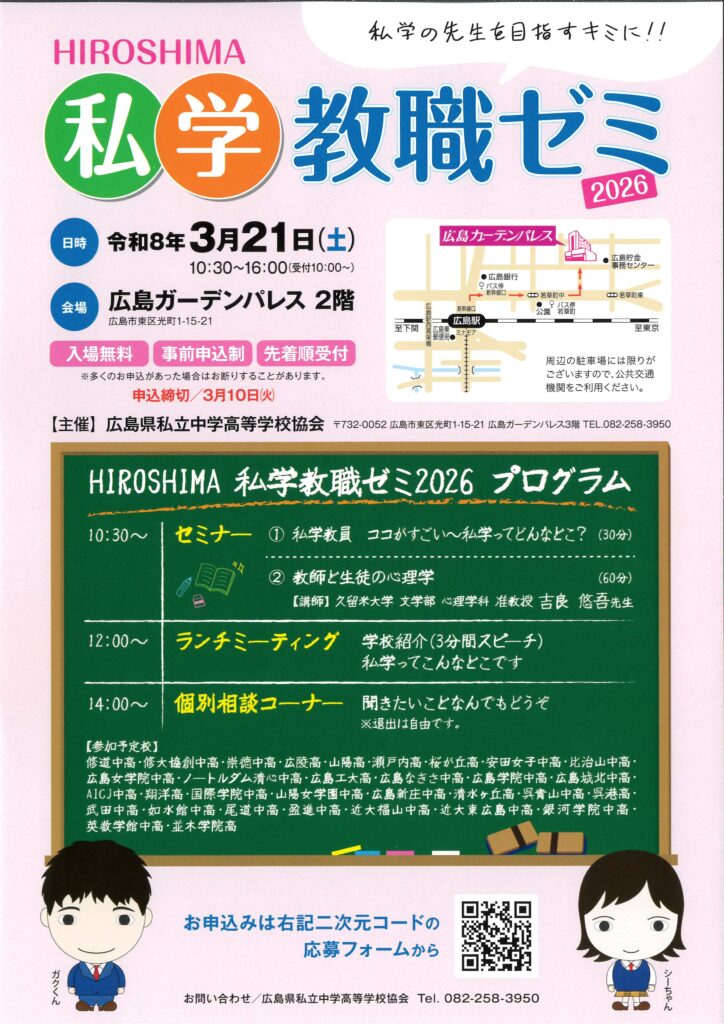 【私学の先生を目指す方へ】「HIROSHIMA私学教職ゼミ」のご案内(3月21日(土))